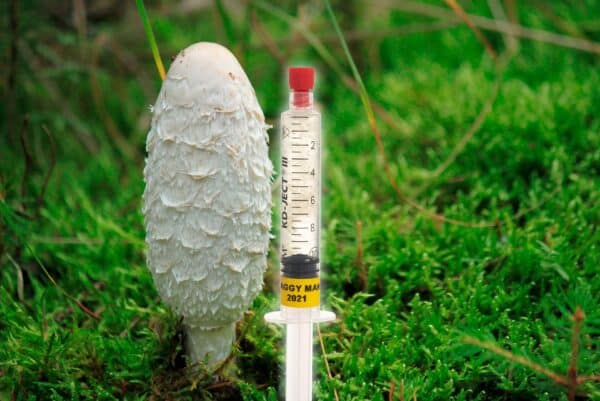 Grzybnia Płynna Czernidlak Kołpakowaty – Shaggy Mane Mushroom Liquid Culture (Coprinus comatus). Czernidłak Kołpakowaty to jeden z najbardziej znanych dzikich grzybów jadalnych. Rzadko jest sprzedawany jako świeży grzyb ze względu na jego słabe właściwości przechowywania. Ma ciekawy zwyczaj topienia się w czarną maź w miarę dojrzewania. Nie jest to rozkład, ale naturalny proces samotrawienia (rozpływania), który pomaga rozproszyć zarodniki grzyba. Aby zapewnić sobie zaopatrzenie, trzeba na nie polować lub uprawiać je w domu. Czernidłaki Kołpakowate można niezawodnie uprawiać w ogrodzie przy użyciu zakopanego bloku z dodatkiem trocin z kieszonką ziarna żyta, skolonizowanej grzybnią. W pełni skolonizowany blok należy wyjąć z worka i zakopać na wiosnę, najlepiej na kupie kompostu na zewnątrz. Czernidłaki Kołpakowate są termotolerancyjne i wydają się być stymulowane przez produkcję amoniaku w pryzmach aktywnego kompostu (chociaż nie mogą przetrwać szczytowego ogrzewania). Grzybnia posadzona na wiosnę powinna wydać grzyby następnej jesieni.Podobno Czernidłak można owocnikować w pomieszczeniach przy użyciu tych samych substratów i technik, które stosuje się w przypadku pieczarki zwyczajnej, Agaricus bisporus lub blisko spokrewnionego Agaricus bitorquis . Wymaga to temperatur znacznie niższych niż normalne temperatury pokojowe, co ogranicza jej uprawę do tych z chłodnymi piwnicami, nieogrzewanymi budynkami gospodarczymi lub ściśle kontrolowaną temperaturą środowiska owocnikowania. Musimy jeszcze spróbować tego w naszych laboratoriach. Grzyby należy zbierać w młodym wieku. Unikaj tych, które zaczęły ciemnieć w wyniku samotrawienia. Odpowiedzialny enzym jest dezaktywowany pod wpływem ciepła, dzięki czemu ugotowane grzyby można przechowywać w lodówce bez niebezpieczeństwa stopienia.